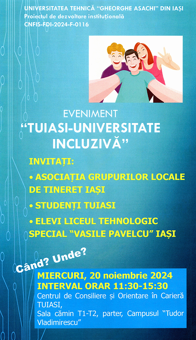 Organizarea unui eveniment/seminar de o zi, în data de 20.11.2024, cu titlul „TUIASI – Universitate lncluzivă”, cu participarea a minim 25 de elevi și studenți,inclusiv cu dizabilități, cadre didactice preuniversitare și universitare precum și reprezentanți din ONG-uri cu activitate specifică. (afiș)